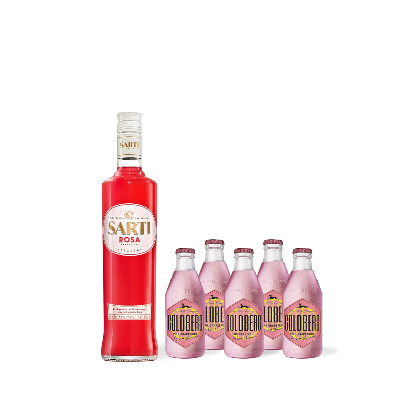 Sarti Rosa zeigt sich ausgewogen, aromatisch und fein bitter. Seine fruchtige Struktur eignet sich ideal für unkomplizierte Spritzvarianten. GOLDBERG Pink Grapefruit verstärkt diese Basis mit klarer Zitrusfrische, dezenter Bitterkeit und einer feinen Kohlensäure. Gemeinsam entsteht ein Drink, der lebendig wirkt, ohne laut zu werden – perfekt für entspannte Treffen, späte Nachmittage oder einen Aperitif im Garten. Ein Bundle, das Frische schenkt und zugleich angenehm reduziert bleibt.