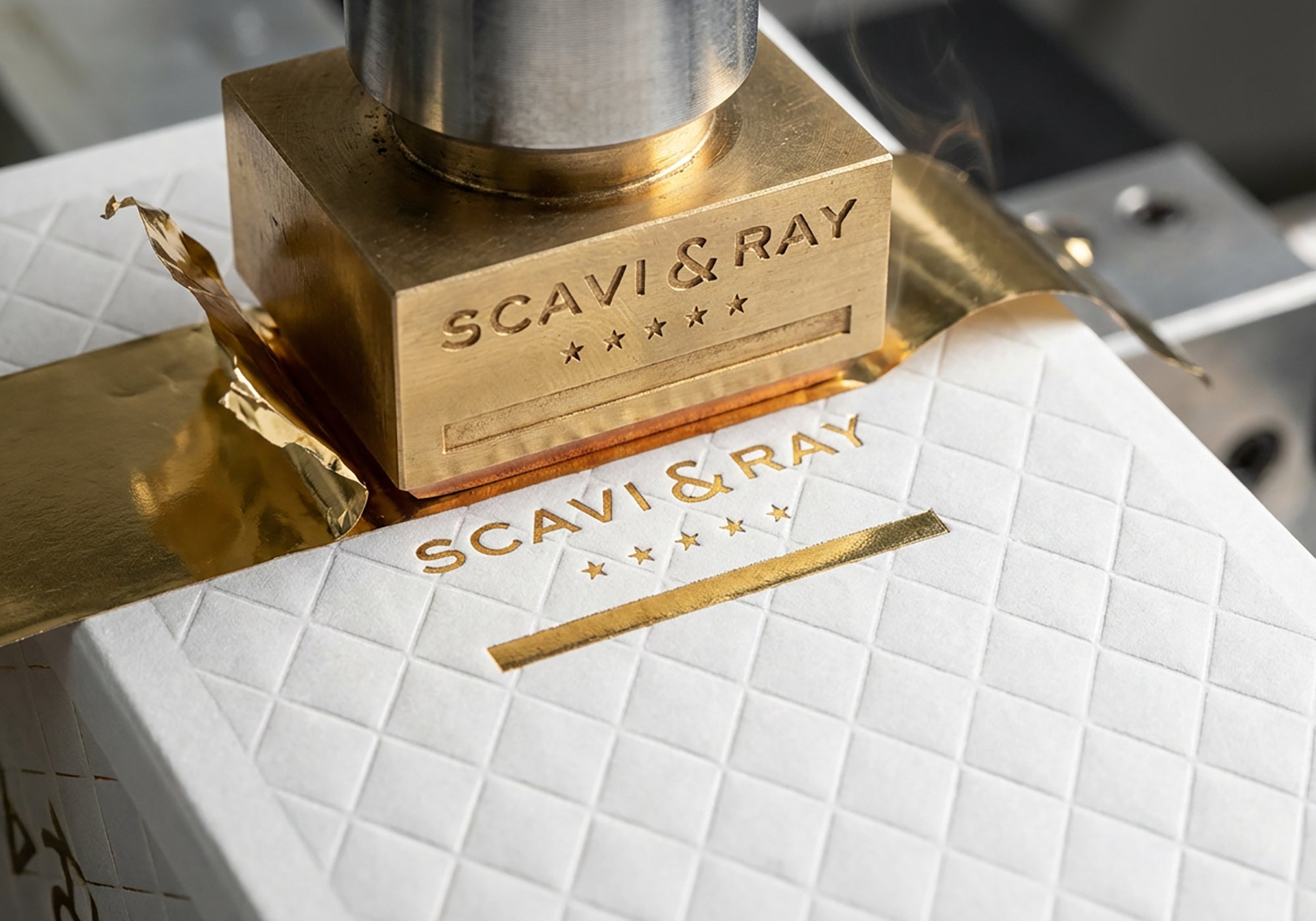 Die exklusive SCAVI & RAY Geschenkverpackung wird aus hochwertigen Feinkartonagen gefertigt und in einem mehrstufigen Prozess veredelt. Die glänzende Heißfolienprägung setzt funkelnde Akzente, die sich je nach Lichteinfall verändern und dem Packaging eine luxuriöse Tiefenwirkung verleihen. Das Zusammenspiel aus Struktur, Material und Metallic-Details macht jede Box zu einem eleganten Präsent, das schon vor dem Öffnen Vorfreude weckt.